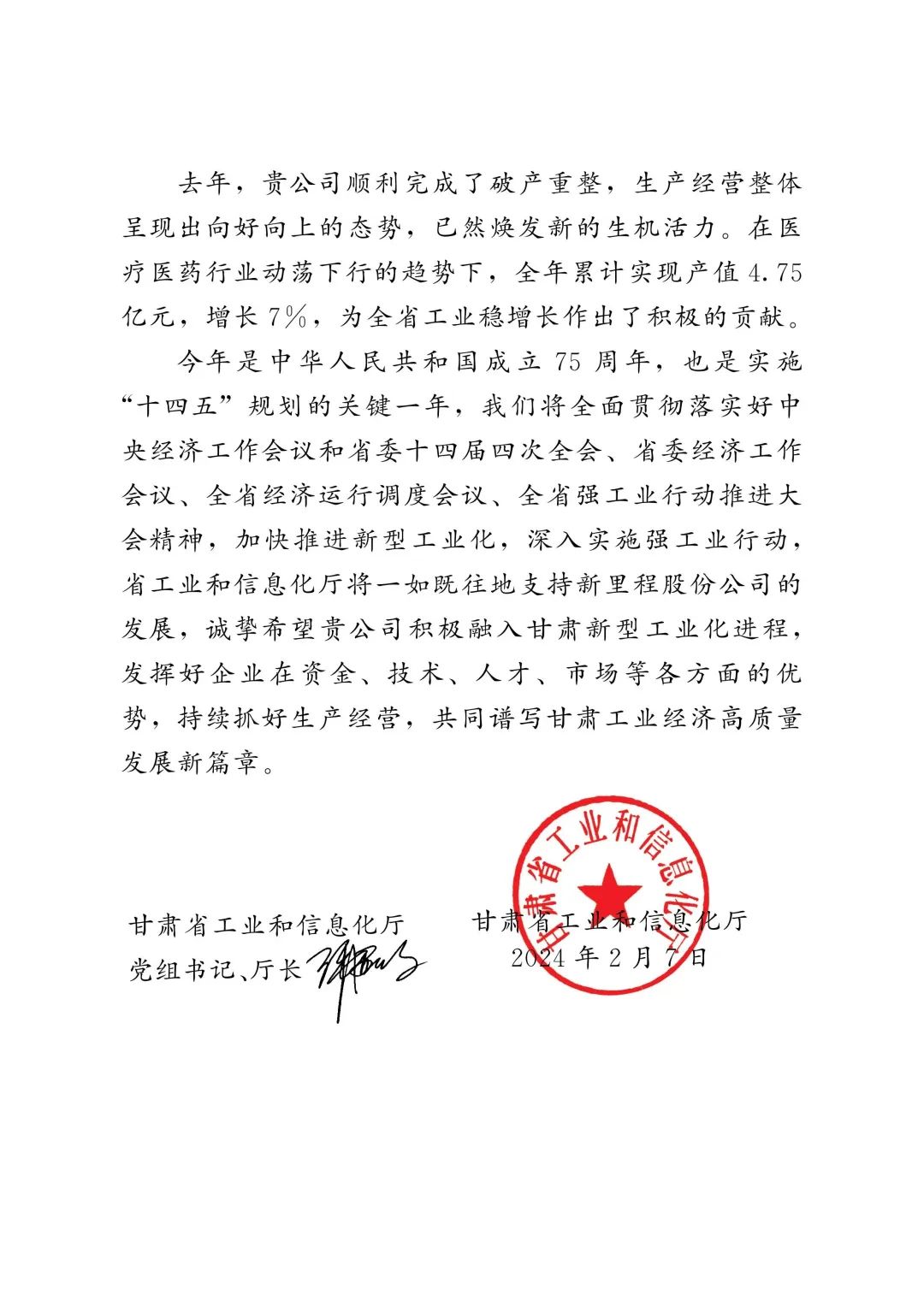 信中提到,独一味制药作为甘肃省内知名的医药企业,在过去的一年中重新出发,凭借强大的市场适应能力和抗风险能力,成功实现了生产经营的向好向上态势。在医药行业的动荡和下行趋势下,独一味制药依然能够保持稳健的增长,为全省工业稳增长作出了积极贡献。