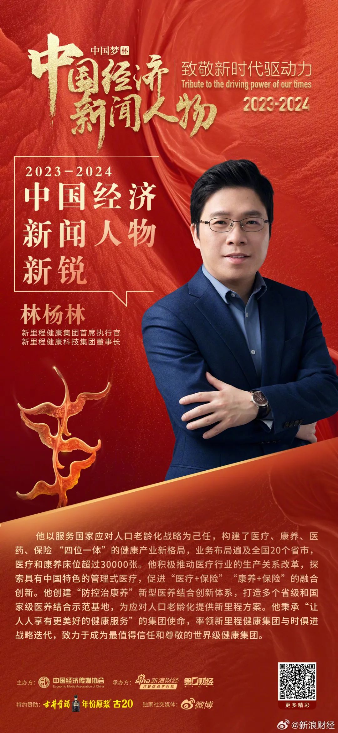 “中国梦杯•中国经济新闻人物——2023中国经济年度人物”评选是由中国经济传媒协会主办,新浪财经、第一财经承办,是全国评比达标表彰保留项目。中国经济新闻人物(2023-2024 )评选以“致敬新时代驱动力”为主题,从“创新性、颠覆性、前瞻性、成长性、新锐性”五大维度,寻找新时代引领商业之美、产业之变、时代之潮的领袖型企业家和著名经济界人士,为贯彻新发展理念,构建新发展格局,推动中国经济可持续发展营造良好舆论氛围。